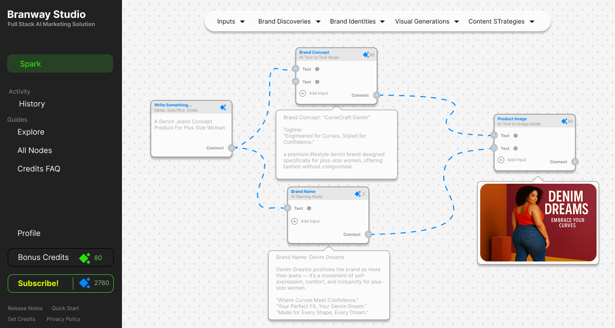 Each node acts like a dedicated marketing specialist — from copywriting to design to strategy. You connect 1–3 inputs (just like handing off work to a teammate), and the nodes collaborate to produce one aligned, unique marketing outcome. It’s like having an entire marketing team working in sync — without the delays.
